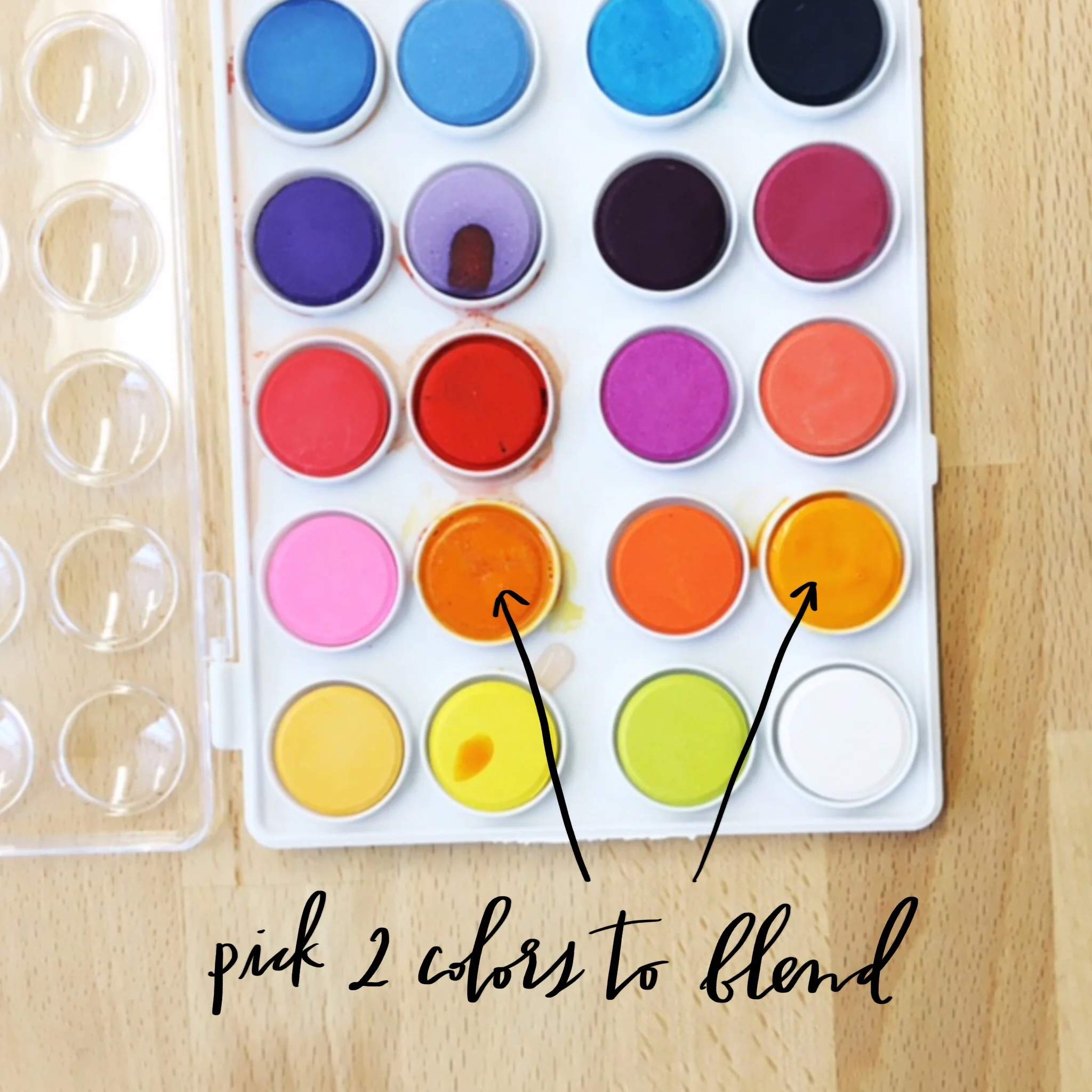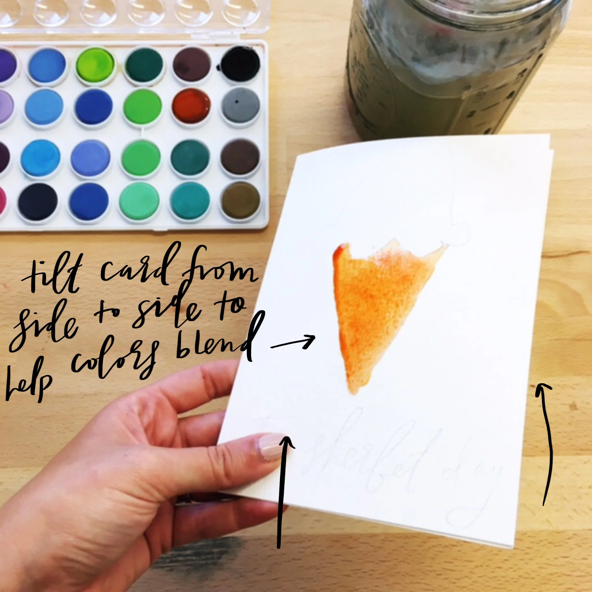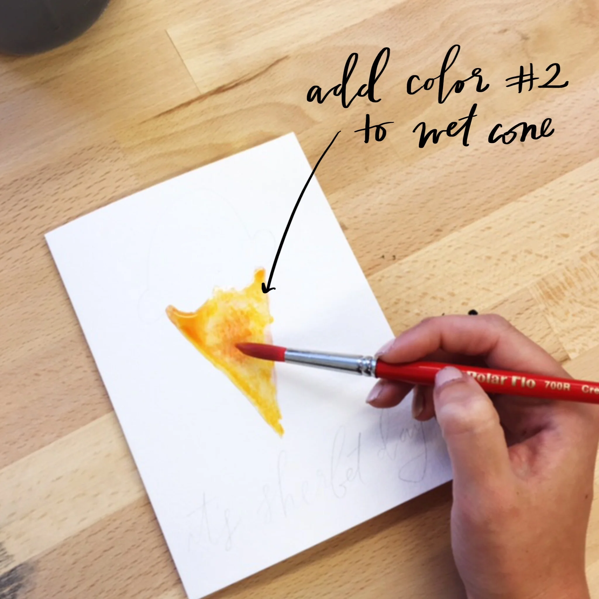 Pick two colors you think will blend well. I picked a orange and a mustard-y yellow. Wet the darkest color you chose first, and then dab that pigment within the wet cone area on your card.