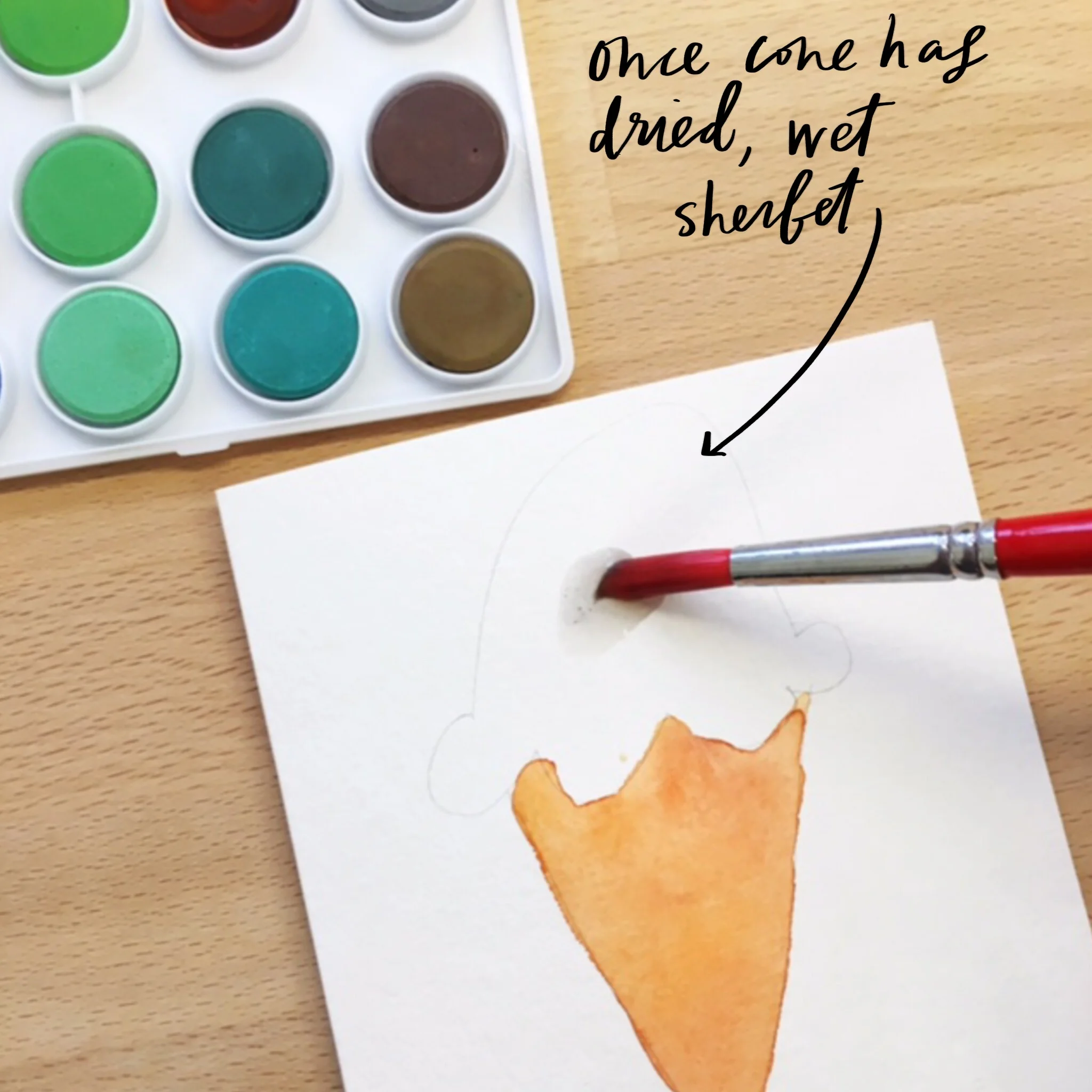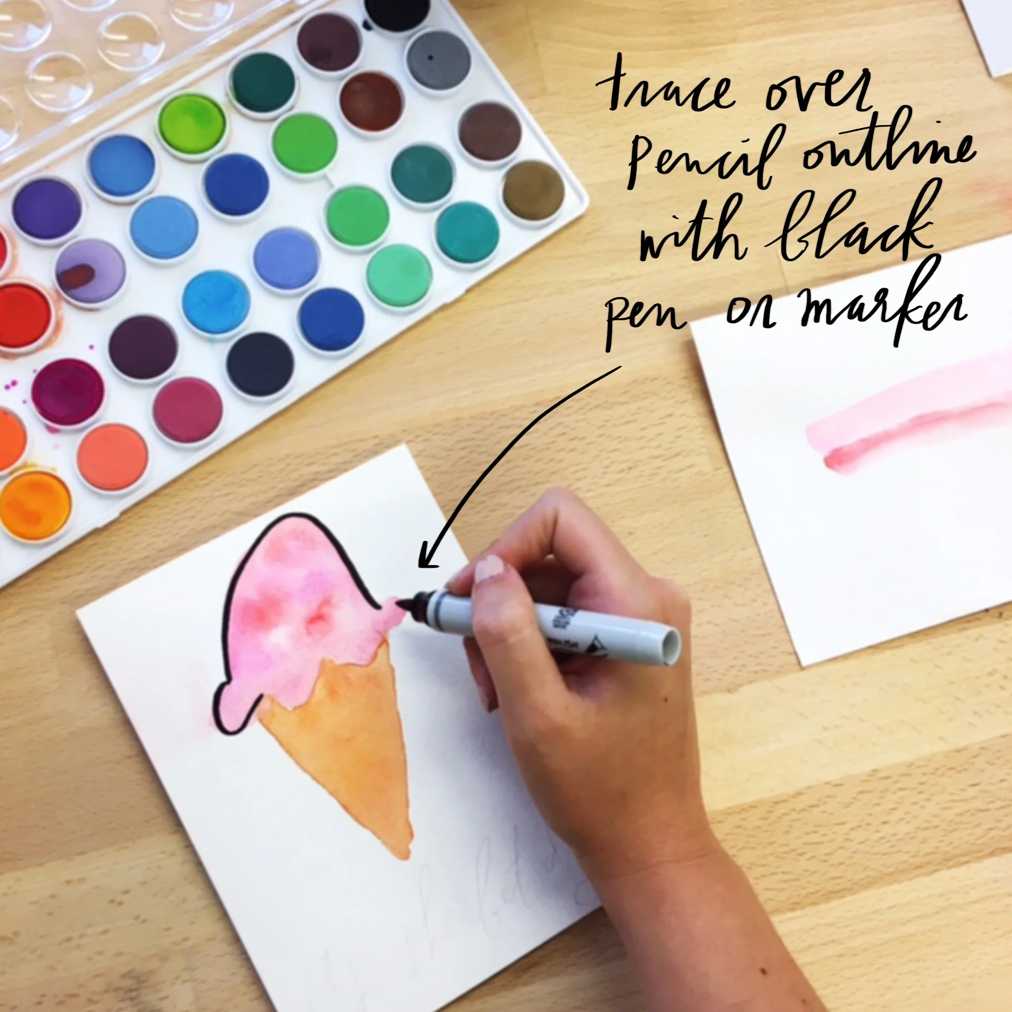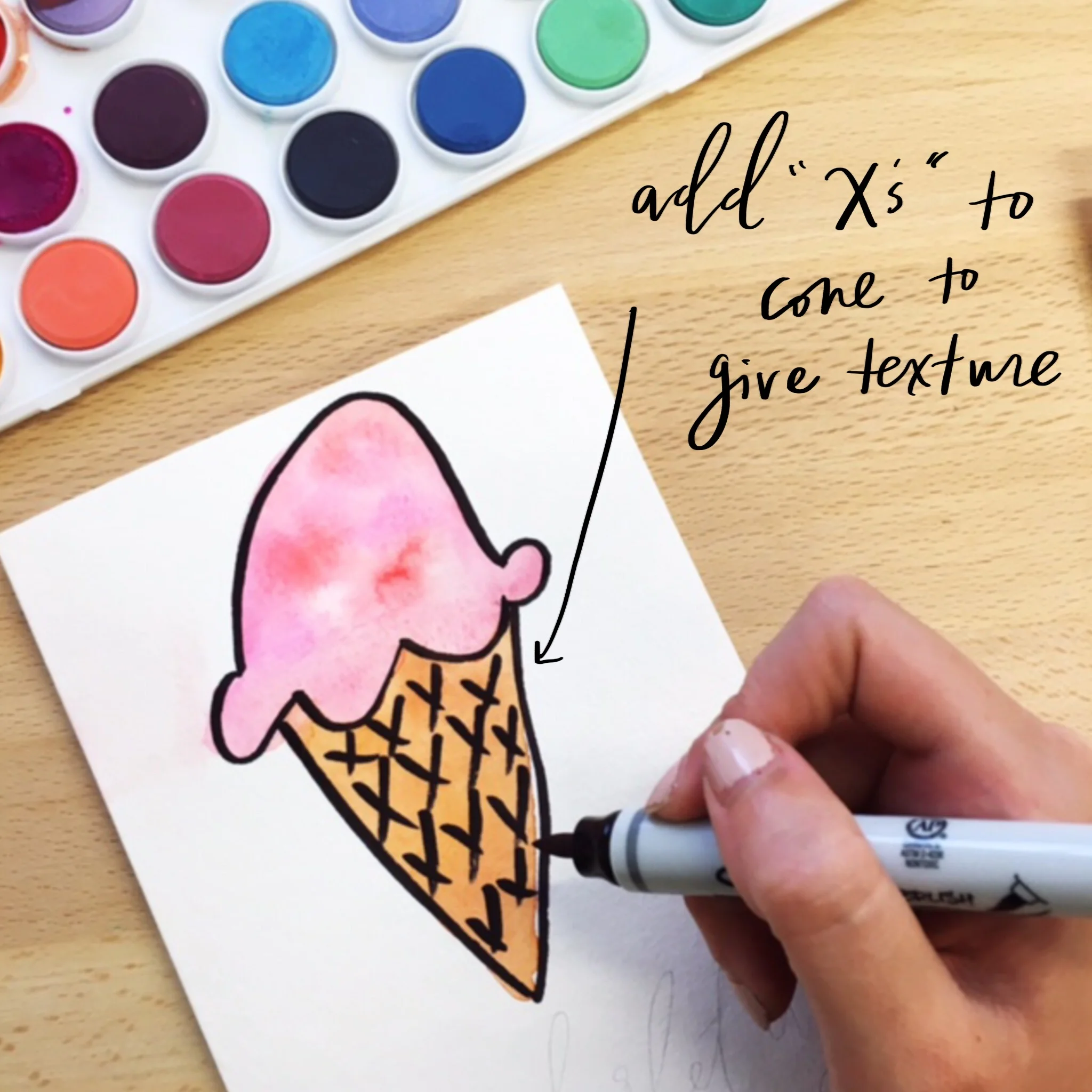After your sherbet cone is COMPLETELY dry, take your sharpie outline the design. I personally like it when it's not perfect (aka the watercolor is outside the lines). After you've outlined your pencil marks, add X's inside the cone part to give the design some texture and interest.