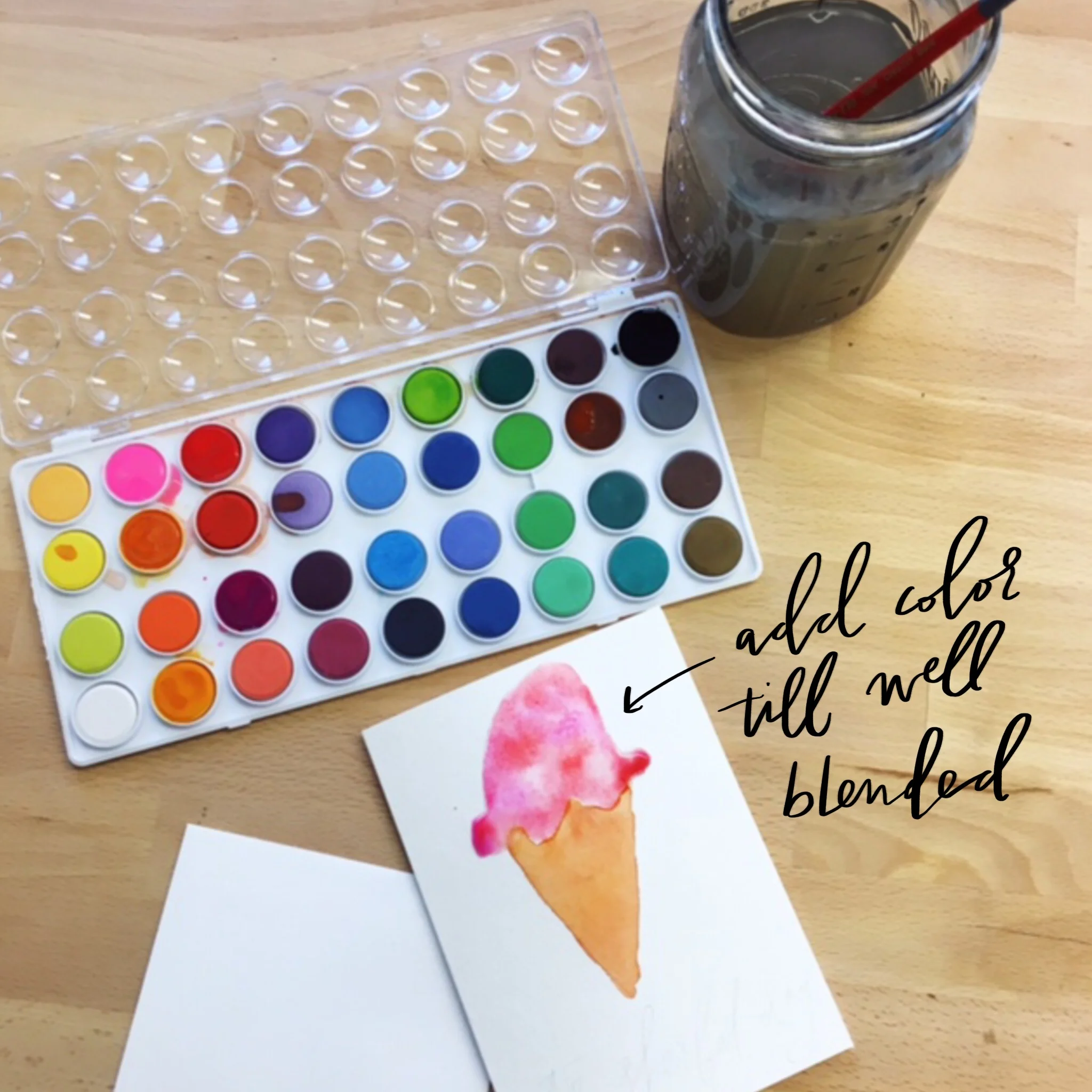 Clean off your brush in water by rubbing softly against the side of your jar and swishing around. Add the second, lighter color, to the wet cone area. Add until pigment covers the whole cone area. Lift your card and tilt it from side to side so colors blend. Lay the card to the side to dry.