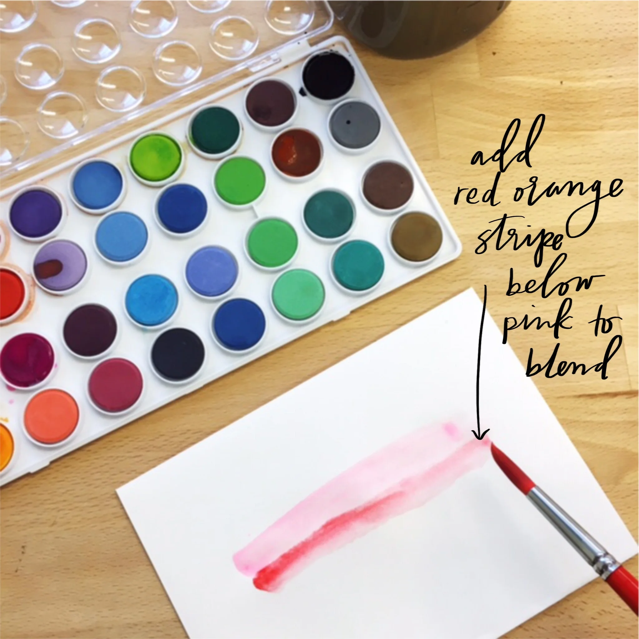 While the top of the sherbet is drying, take your envelope and add a stripe of a light pink in the center. NOTE: You want to make sure you don't have too much water and/or pigment on your brush or it will severely warp your paper! Take your brush and add that pretty red orange color stripe right underneath (slightly overlapping) the pink stripe. Hopefully they will both be wet enough to slightly blend.