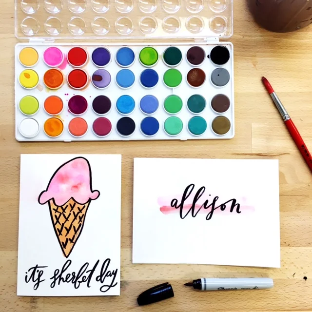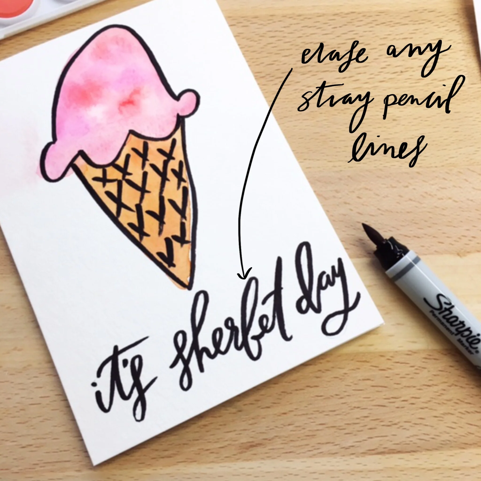 For the "it's sherbet day" font, a normal print font will be just fine if you aren't feeling confident in your brush lettering abilities. If you have good cursive, you can do that and later, make your downstrokes extra thick to make it faux calligraphy! I opted for cursive and just an even thickness of marker to trace.